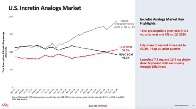 事实上,也有分析认为,对于药企回扣作为主要收入来源之一的CVS,突然宣布调整目录的举措,或许也是诺和诺德对礼来市场份额反扑的“应激反应”。据礼来Q1财报PPT数据,Zepbound已实现对竞品的市场份额超越,甚至明确宣称:“Zepbound已是美国减重品牌药市场的领导者,无论是处方总量,还是新增处方量。”