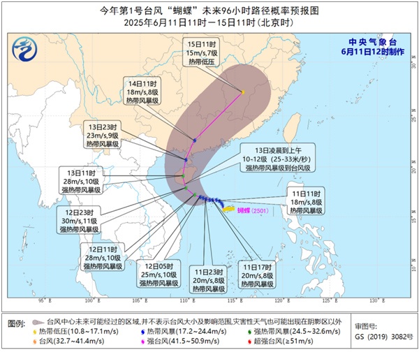 中国天气网讯 今年第1号台风“蝴蝶”今天(6月11日)已经生成,13日或在华南两次登陆。今天起至13日,海南岛、广东东南部、广西西南部等地将有强降雨,局地或有特大暴雨。14日至15日随着台风北上与冷空气相遇,强降雨还可能波及广东、江西、福建、浙江等地,强降雨范围、强度可能不亚于台风登陆时。