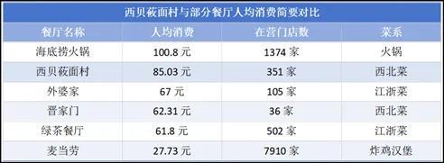 在连锁中式正餐品牌中,西贝的这一客单价水平高于外婆家、绿茶餐厅等连锁中餐店,比同为西北菜的晋家门,高出20元以上。