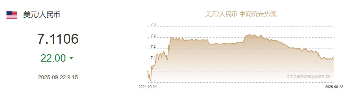 9月22日人民币对美元中间价报7.1106元 上调22个基点