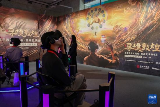 9月21日,在第八届丝绸之路(敦煌)国际文化博览会上,与会嘉宾借助VR设备沉浸式游览莫高窟虚拟场景。新华社记者 郎兵兵 摄