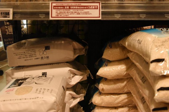 5月21日,在日本东京一家超市,大米货架上张贴着因供应不稳定实施限购的提示。新华社记者胡晓格摄