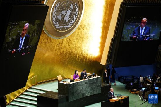 9月23日,在位于纽约的联合国总部,联合国秘书长古特雷斯在第80届联合国大会一般性辩论开幕式上致辞。新华社记者李睿摄