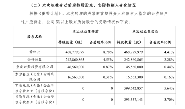 由于股权被大幅稀释,待董事会改选完成后,公司控股股东将由金科控股变更为京渝星筑、京渝星璨,实控人由黄红云变更为无实际控制人。