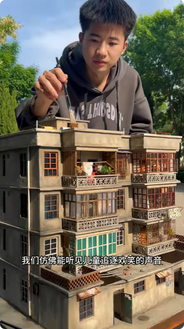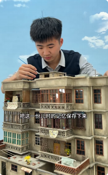 现在,卢庆欢不仅自己做模型,还通过网络直播和线下研学活动推广这项技艺。他希望能让更多年轻人了解传统文化,留住那些正在消失的老建筑。这些承载着乡愁的小房子,正在成为连接过去与未来的桥梁,也在书写着一个00后创业者的精彩人生。男生回应做老房子微缩模型年入百万 巧手复刻乡愁。