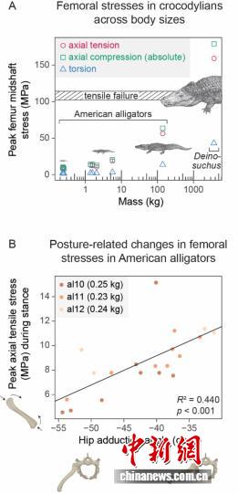 鳄类股骨应力在不同(A)体型和(B)肢体姿势下的变化(短吻鳄和恐鳄插图由TakashiOda绘制)。中国科学院古脊椎所 供图