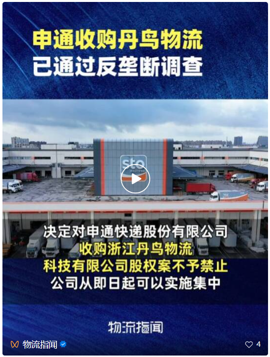 10月30日,申通快递公告,公司收到国家市场监督管理总局出具的《经营者集中反垄断审查不予禁止决定书》,决定对申通快递股份有限公司收购浙江丹鸟物流科技有限公司股权案不予禁止。公司从即日起可以实施集中。本次交易相关方尚需按照交易协议的约定完成交易价款支付、股权转让工商登记等工作。