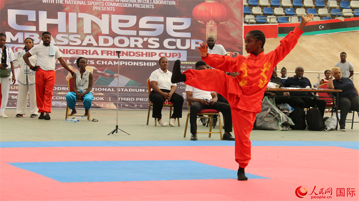 人民网阿布贾11月1日电 (记者姜宣)10月31日,“中国大使杯”尼日利亚武术锦标赛决赛在阿布贾国家体育馆举行。本次活动由中国驻尼日利亚大使馆和尼日利亚国家体育委员会联合主办,尼日利亚中国文化中心和阿布贾武术协会联合承办。中国驻尼日利亚大使于敦海,尼日利亚国家体育委员会主席谢胡、总干事布科拉出席决赛活动并致辞,尼日利亚中国文化中心主任杨建兴参赞,尼日利亚联邦首都区社会发展秘书处常秘奥卢布米,及尼日利亚多个文化体育机构嘉宾、多所学校师生、在尼中资企业代表等逾千人参加了活动。