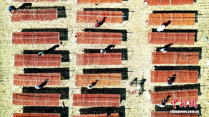 11月10日,永定区陈东乡城东村的柿饼晾晒场一派繁忙。柿农徐满娣正带着村民忙着制作订单柿饼,竹架上金灿灿的柿饼整齐排列,远远望去,仿佛给大地披上了一层“黄金甲”。