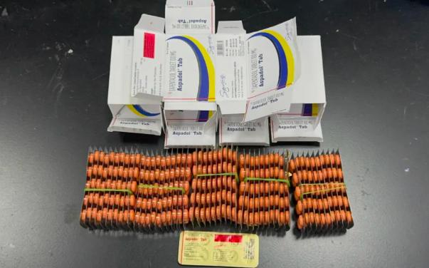 广州海关所属广州邮局海关关员在对一批进境邮件进行监管时,发现1件邮件存在异常。经开箱查验,现场关员发现邮包内的上层是整齐摆放的抗寄生虫药片,底部还有5个纸质包装盒,盒内装有多粒橙色药片。经送技术机构鉴定,确认上述橙色药片含有他喷他多成分,共计500粒。