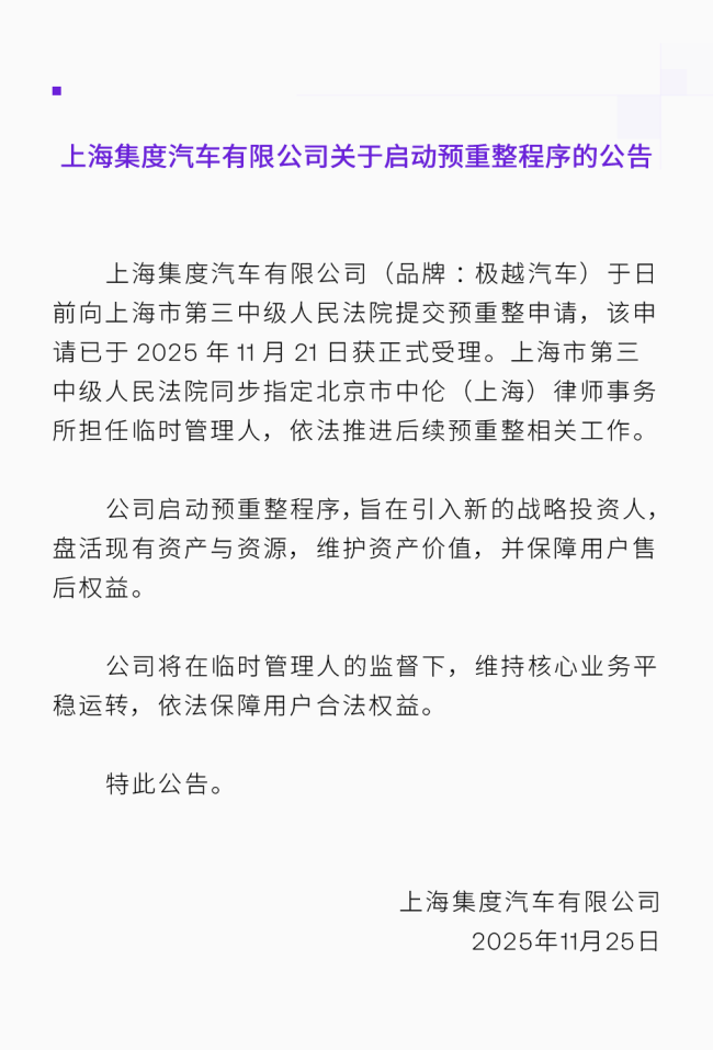 在当日的公告中,极越表示该公司日前向上海市第三中级人民法院提交预重整申请,该申请已于2025年11月21日获正式受理。上海市第三中级人民法院同步指定北京市中伦(上海)律师事务所担任临时管理人,依法推进后续预重整相关工作。集度表示,公司启动预重整程序,旨在引入新的战略投资人:盘活现有资产与资源,维护资产价值,并保障用户售后权益。