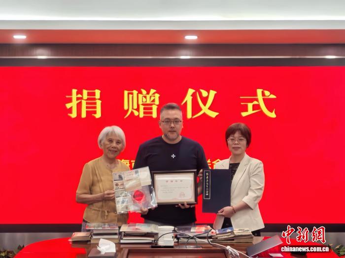 2025年,陈杨(中)向上海市侨联捐赠首批120余件侨史文物。(受访者供图)