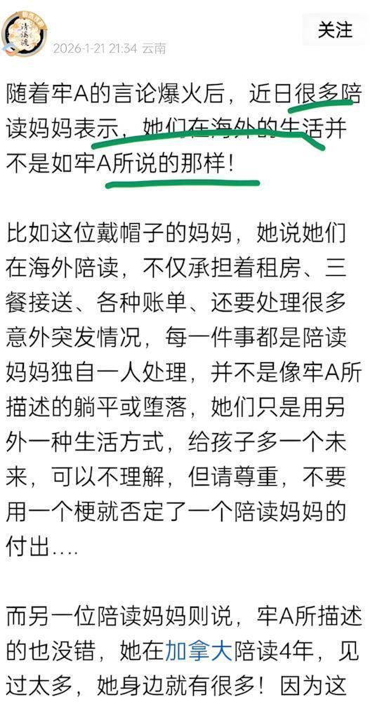 一位在加拿大陪读四年的妈妈表示,经济条件好时人性的问题难免会出现。一位英国留学的女生也站出来发声,指出牢A只代表美国的情况,不应一概而论。还有人认为,舆论中的“标签化”现象很可怕,个别行为被放大成整个群体的问题,使认真读书的留学生无辜受牵连。