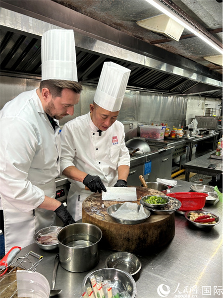 广东汕头,人民网外专柯明可向陈志毅师傅(右一)学习烹饪技艺。人民网 王潇平摄