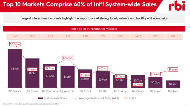 截至2024年12月的一年,在RBI的十大国际市场中,中国是汉堡王门店数量最多的市场(1474家),但系统销售额仅约7亿美元,排在第八,单店收入明显偏低。