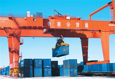 图为2月26日,中国铁路哈尔滨局集团有限公司满洲里站对回程中欧班列进行换装作业。