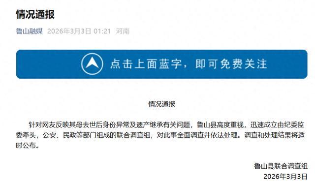 舅妈冒用女孩亡母身份结婚侵吞遗产 亡母“被结婚”引发关注。近日,孙女士通过网络反映母亲去世后“被结婚”等异常情况,引发广泛关注。3月3日,河南鲁山县联合调查组发布通报称,针对网友反映其母去世后身份异常及遗产继承问题,鲁山县迅速成立由纪委监委牵头、公安和民政等部门组成的联合调查组进行全面调查并依法处理。调查结果将适时公布。