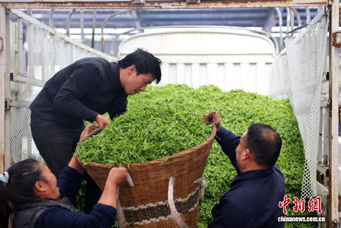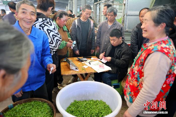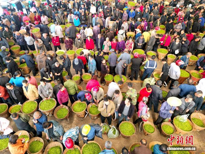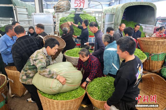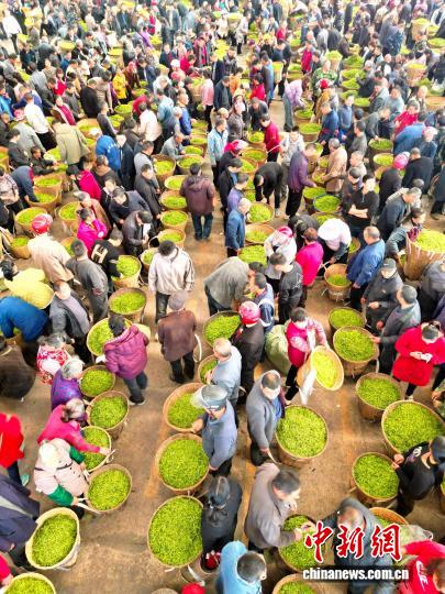 3月11日,在四川省雅安市名山区双河鲜叶交易市场和红星镇鲜叶交易市场内,随着正式开市,市场内人头攒动,呈现出购销两旺的场景。中新社记者 张浪 摄