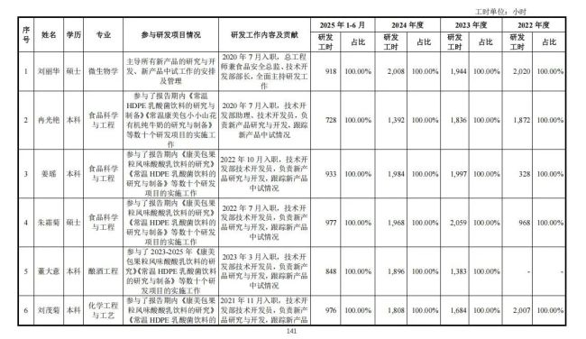 招股书显示,2022年末至2024年末以及2025年上半年,南方乳业研发人员数量分别为48人、47人、44人和46人,而且研发人员的变动特别大。