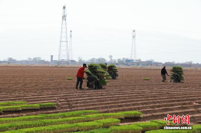 春日时节,山西省忻州市忻府区南湖村,村民们正抢抓农时,利用新技术进行葱苗移栽。张媛摄