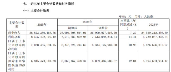近日,海天味业披露的2025年全年业绩数据显示,公司实现总营收288.7亿元,同比增长7.32%;归母净利润70.4亿元,同比增长10.95%;扣非净利润68.45亿元,同比增长12.81%。