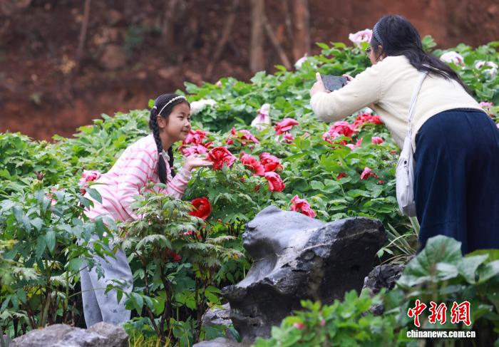 4月12日,位于浙江舟山普陀区的沈院内牡丹花盛开,吸引游人参观打卡。中新社记者 贾天勇 摄