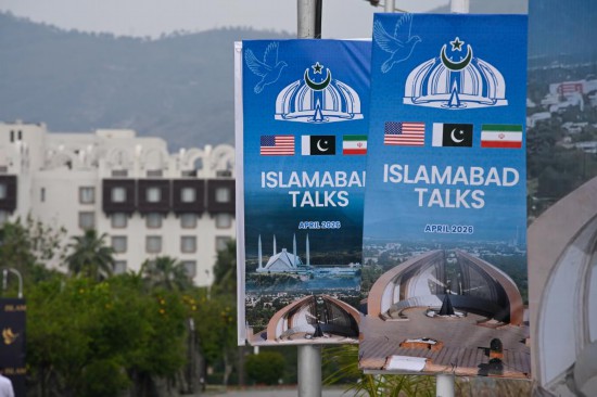这是4月11日在巴基斯坦伊斯兰堡的美伊谈判新闻中心外拍摄的谈判相关海报。新华社发(王申摄)
