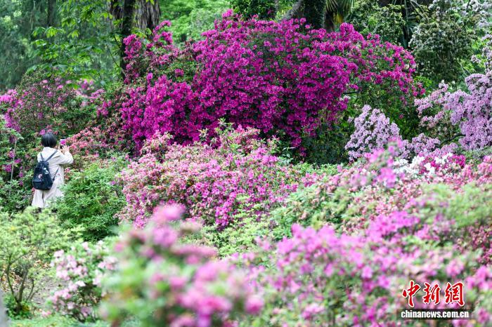 4月15日,游客在盛开的杜鹃花海里拍照。中新社记者 张畅 摄