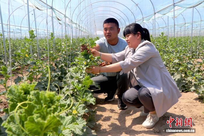 图为农技人员深入瓜棚查看蜜瓜长势,为种植户解决生产技术难题。(资料图) 马爱彬 摄