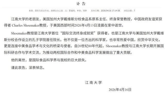 4月16日,江南大学发布讣告,宣布美国加州大学戴维斯分校食品系原系主任、终身荣誉教授Charles Shoemaker教授于美国西部时间2026年4月13日凌晨在家中逝世。他是中国政府友谊奖获得者,也是江南大学首位“国际交流终身成就奖”得主,并曾担任江南大学与美国加州大学戴维斯分校合作设立的孔子学院首任院长。