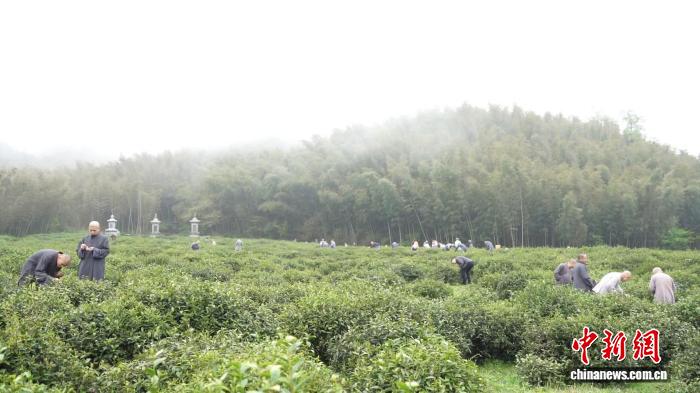 谷雨时节,千年古刹真如禅寺周边的上百亩茶园里,全寺上下“出坡”采茶。真如禅寺供图