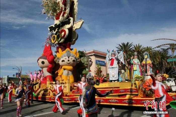 当地时间2008年1月1日,美国帕萨迪纳新年玫瑰花车游行上的北京奥运花车。(受访者此前供图)
