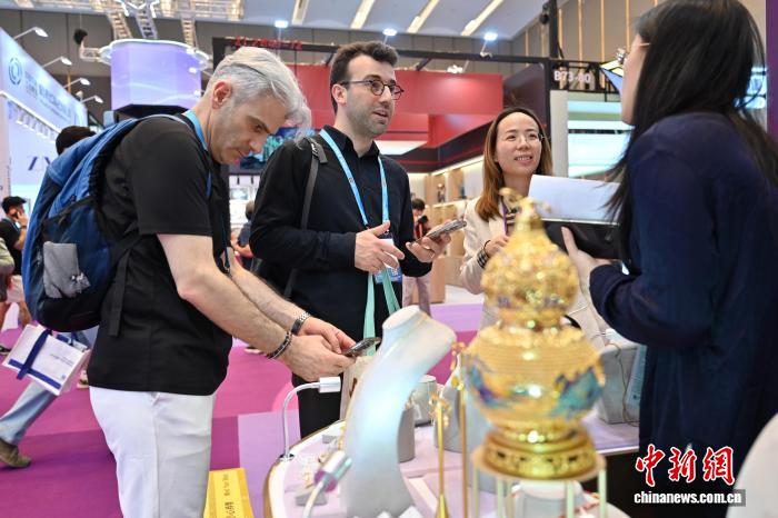 图为境外采购商在时尚饰品专区和参展商洽谈。中新社记者 陈楚红 摄