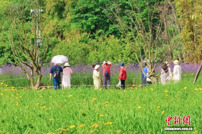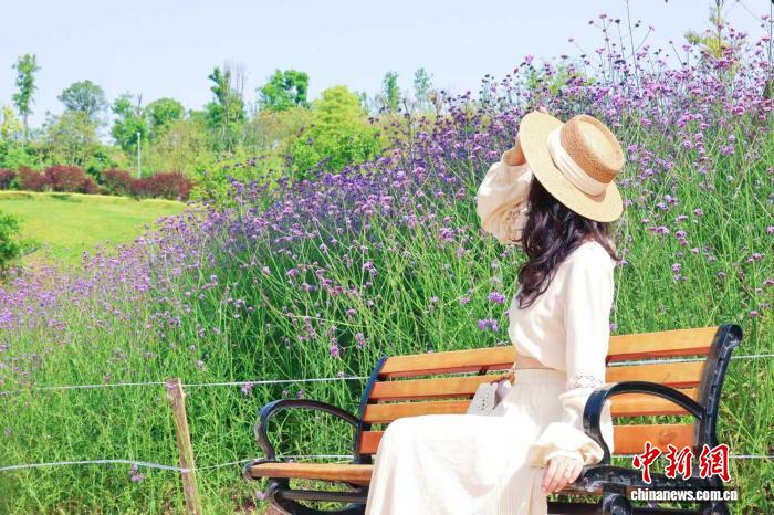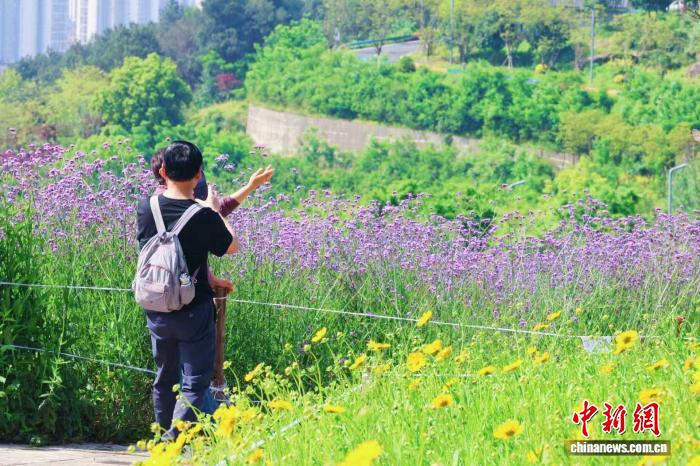 图为成片的马鞭草迎来花期,吸引众多市民前来休闲观光。 谭超平 摄
