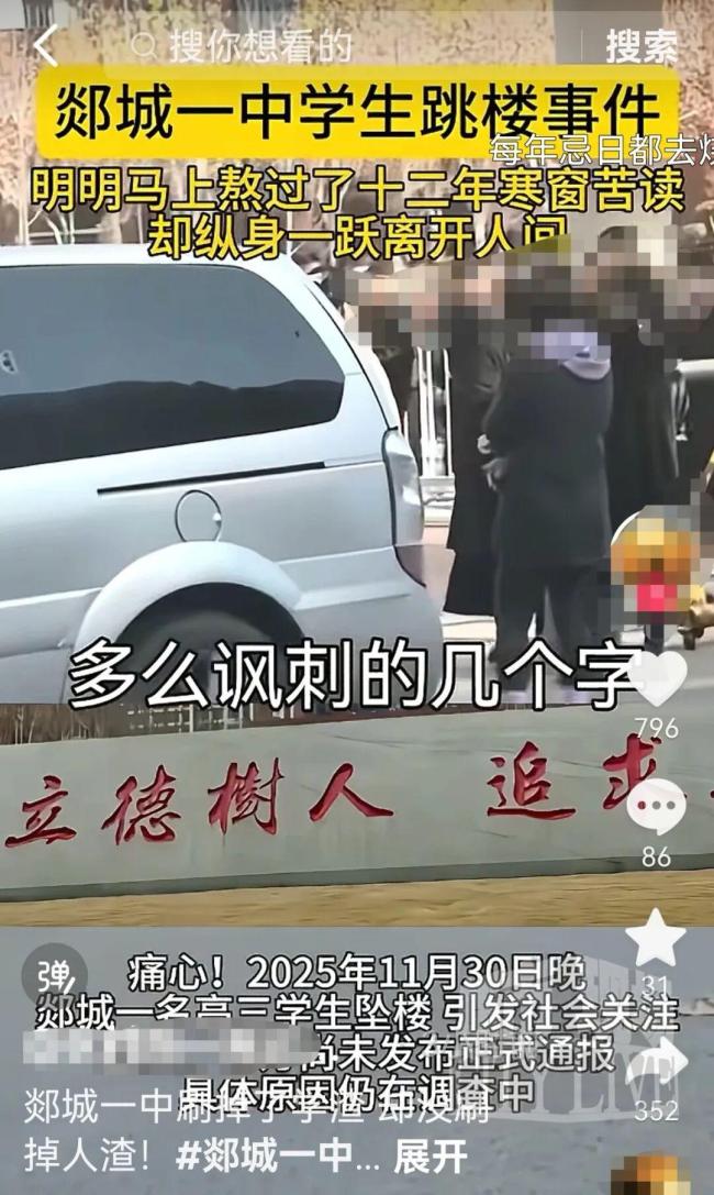 山东郯城一高中生校外坠楼身亡 事件引发网友关注 今天早上,多位网友在社交平台发布视频,称山东省临沂市郯城第一中学一名高中生坠楼身亡,引起广泛关注。上午9点半左右,记者联系了郯城第一中学,校方工作人员证实,事件发生在11月29日晚,坠楼学生为高三21班学生 12-02