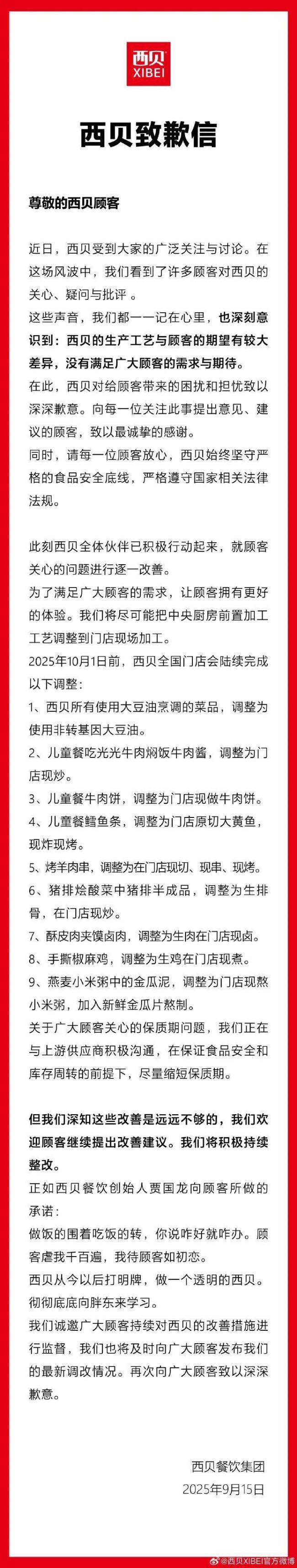西贝门店调整进展 全国整改进行中 9月15日中午,西贝餐饮集团发布了一封致歉信。信中表示,公司深刻意识到生产工艺与顾客的期望存在较大差异,未能满足广大顾客的需求与期待。为解决这一问题,西贝承诺将在10月1日前完成全国门店的相关整改调整 09-19