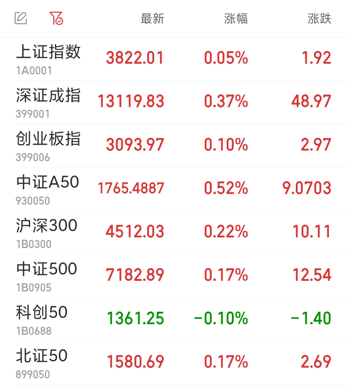 A股三大指数集体高开,贵金属板块领涨 中新经纬9月22日电 周一,A股三大指数集体高开。上证指数涨0.05%,报3822.01点;深证成指涨0.37%,报13119.83点;创业板指涨0.10%,报3093.97点。 09-22