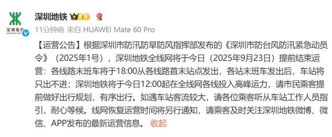 深圳地铁提前结束运营 根据深圳市防汛防旱防风指挥部发布的紧急动员令,深圳地铁全线网将于2025年9月23日提前结束运营。各线路末班车将在18:00从首末站点发出,之后车站将只出不进。自今日12:00起,深圳地铁将在全线网各线投入高峰运力 09-24