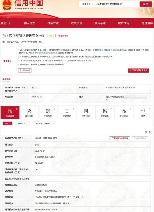 网红餐饮店因逃税被罚74万余元,店铺回应 正常营业无可奉告 1月6日,广东汕头一家名为“创新土鸡”的网红餐饮店(主体为汕头市创薪餐饮管理有限公司)因逃避缴纳税款被税务部门处以74.81万元罚款,此事引发了广泛关注 01-07