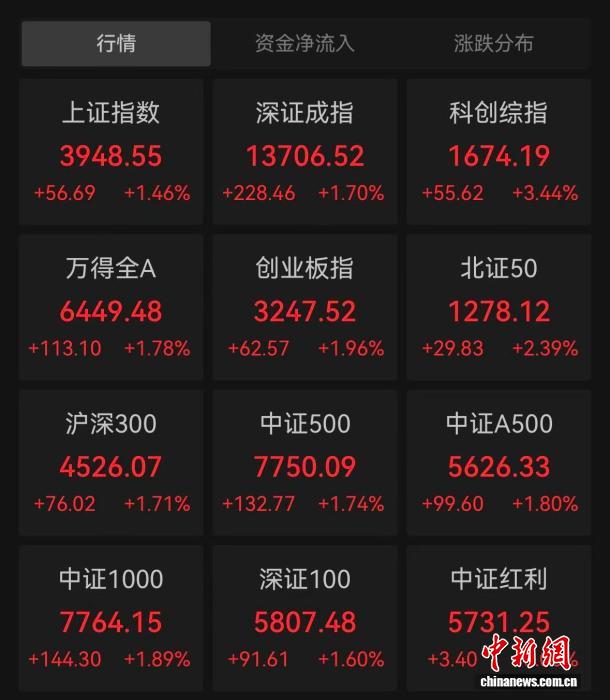 A股三大股指集体收涨 中新网4月1日电 (记者 谢艺观)1日,A股三大股指集体收涨。截至收盘,沪指涨1.46%,深证成指涨1.7%,创业板指涨1.96%。全市全天成交额超2万亿元,近4500只个股上涨。生物科技、海运、制药等行业板块涨幅居前。(完) 04-01