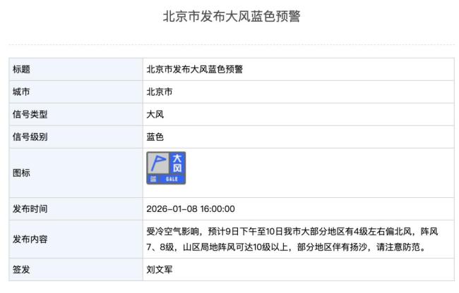 北京大风预警!局地阵风超10级,周日最高0℃ 冷空气来袭注意保暖 1月8日16时,北京市发布大风蓝色预警。受冷空气影响,预计9日下午至10日,北京市大部分地区将出现4级左右的偏北风,阵风可达7到8级,山区局地阵风甚至可能达到10级以上,部分地区伴有扬沙,请注意防范 01-09