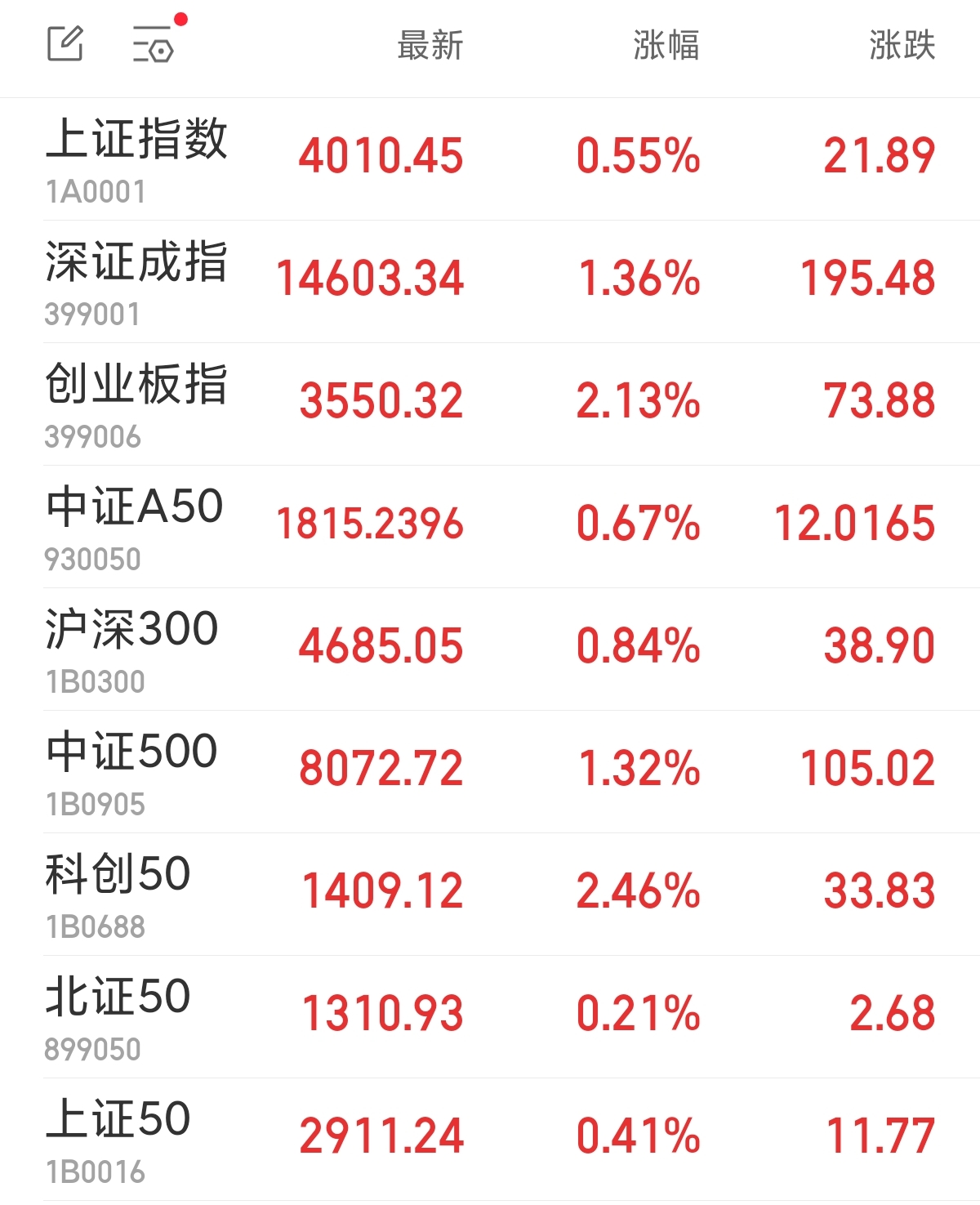 创业板指半日涨2.13% 半导体板块集体大涨 中新经纬4月14日电 周二早盘,A股三大指数高开高走。截至午间收盘,上证指数涨0.55%,报4010.45点;深证成指涨1.36%,报14603.34点;创业板指涨2.13%,报3550.32点。 04-14