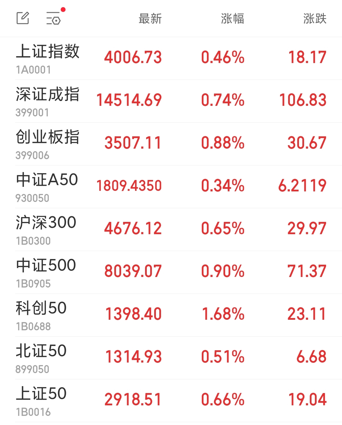 A股三大指数集体高开 贵金属板块领涨 中新经纬4月14日电 周二,A股三大指数集体高开。上证指数涨0.46%,报4006.73点;深证成指涨0.74%,报14514.69点;创业板指涨0.88%,报3507.11点。 04-14