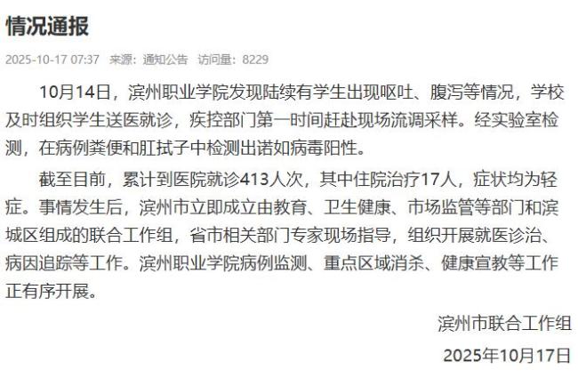 官方通报滨州多名学生呕吐腹泻 诺如病毒阳性确诊 10月14日,滨州职业学院发现学生陆续出现呕吐、腹泻等症状。学校迅速组织学生就医,并联系疾控部门进行现场调查和采样。实验室检测结果显示,病例粪便和肛拭子中诺如病毒呈阳性 10-17