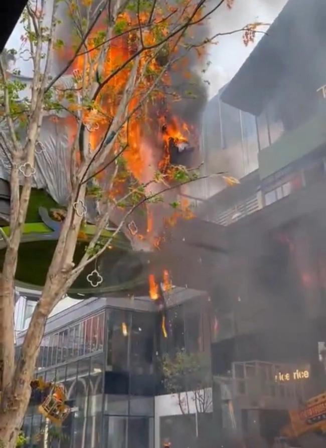 苏州一商场装饰物发生火情 消防已到场处理 4月15日上午,有网友发布视频称苏州万象天地一处高处露天走廊上的绿色装饰物发生火情。视频显示现场浓烟滚滚、火势较大,大量火星溅到地面。网友表示有消防车到达现场 04-15