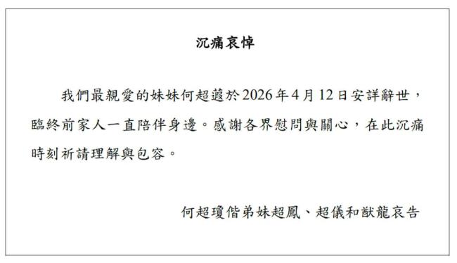 何超蕸去世终年60岁 家族与社会痛失英才 4月12日,“赌王”何鸿燊的女儿、信德集团执行董事何超蕸逝世,享年60岁。信德集团当日发布哀悼声明,并附上家人通告:“我们最亲爱的妹妹何超蕸于2026年4月12日安详辞世,临终前家人一直陪伴身边 04-12