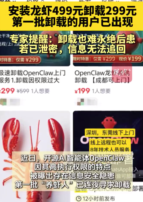 让龙虾知道密码有风险!专家称卸载龙虾仍有可能持续泄密 近日,开源AI智能体“小龙虾”OpenClaw持续火爆。因其高执行权限的特点,被曝出存在信息安全隐患。于是,“卸载龙虾”又成了AI新手的刚需,在电商平台上有人推出299元“上门卸载OpenClaw”的服务,号称可以“0残留”“永绝后患”,事... 03-11