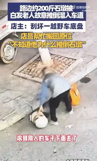 白发老人故意推倒路边200斤石墩溜入车道! 白发老人故意推倒路边200斤石墩。9月22日,湖南邵东,路边约200斤石墩被白发老人推倒,溜入车道,店主称:“刮坏一辆越野车底盘,店员帮忙搬回原位,不知道他为什么要推倒石墩。白发老人故意推倒路边200斤石墩溜入车道... 09-23