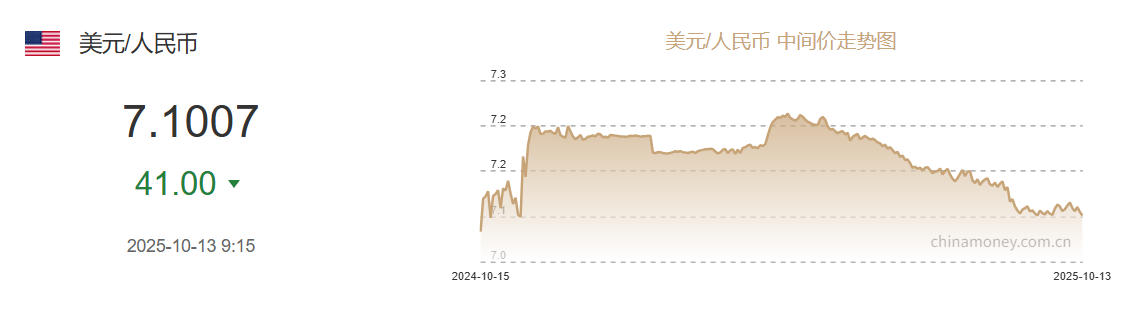 10月13日人民币对美元中间价报7.1007元 上调41个基点 中新网10月13日电 据中国外汇交易中心网站消息,中国人民银行授权中国外汇交易中心公布,2025年10月13日银行间外汇市场人民币汇率中间价为:1美元对人民币7.1007元,上调41个基点。 10-13