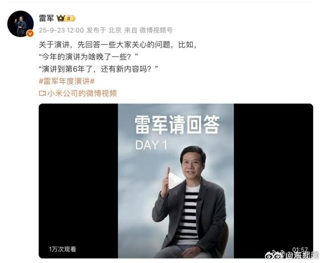 雷军回应演讲推迟原因 为蹭小米17流量 昨日,2025雷军年度演讲正式宣布定档9月25日。消息一出,迅速登上多个平台的热搜榜单。今年的雷军年度演讲相比往年有所推迟。在小米官方发布的短视频中,雷军解释了推迟的原因:为了蹭自家小米17的流量 09-23